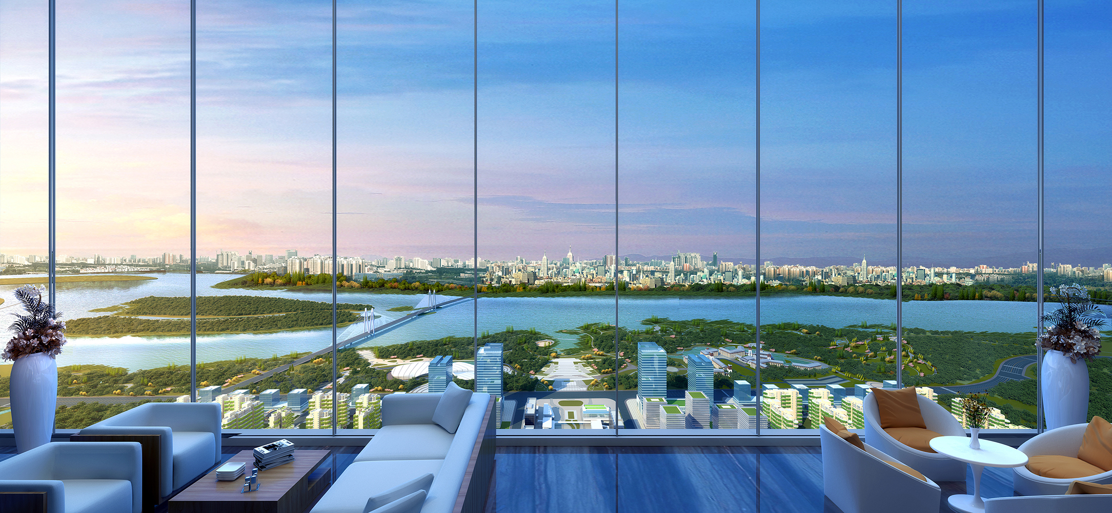 中軸兩端濱江、濱湖觀景平臺(tái),超高層建筑360°觀景陽臺(tái),構(gòu)成了 “城市陽臺(tái)”系統(tǒng),置身其間,一副自然與城市交融的山水畫卷賞心悅目。